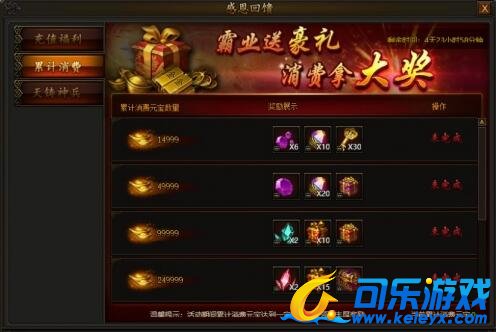 活动期间,累计消费一定数量元宝,即可领取对应档奖励,每个角色只能领取一次。
