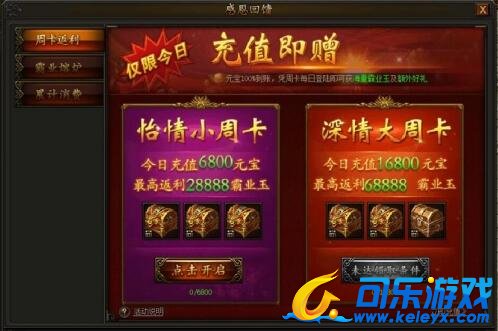 活动期间,首日充值满一定数量元宝,即可领取对应档次周卡,一周保持充值可领更多奖励。