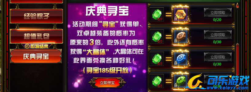 活动内容:玩家在寻宝中有概率可获得大晶体,使用大晶体可兑换游戏中稀有道具,详情请根据游戏中活动兑换页面为准。