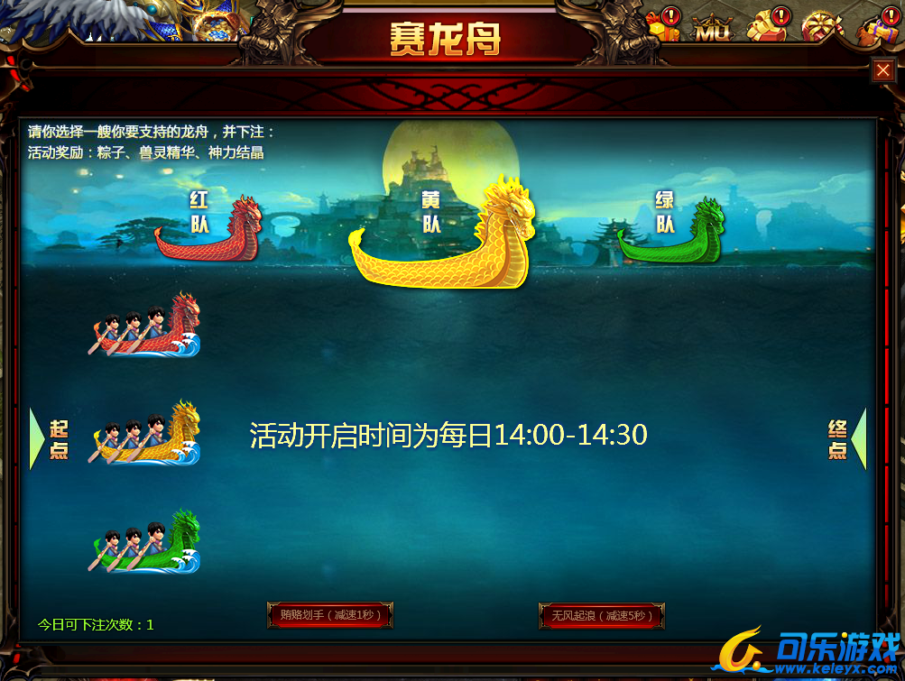2. 活动开启的前五分钟为报名时间,届时可以选择三支队伍中你所支持的龙舟并下注。