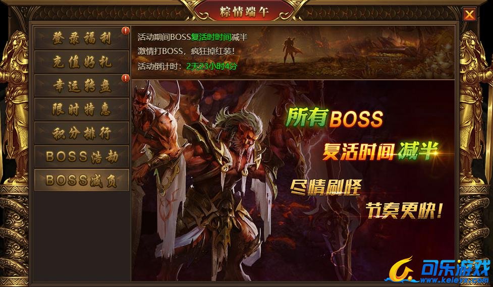 活动内容:活动期间BOSS复活时间减半(跨服BOSS除外)