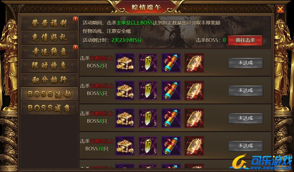 活动内容:活动期间击杀主宰及以上BOSS达到指定数量即可领取奖励