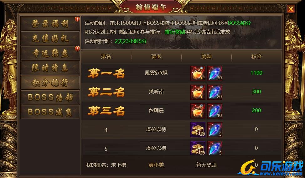活动内容:活动期间击杀1500级以上的boss和转生boss获得积分,活动结束后更加排行邮件发送奖励
