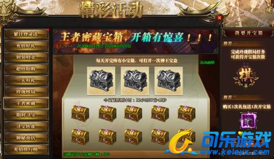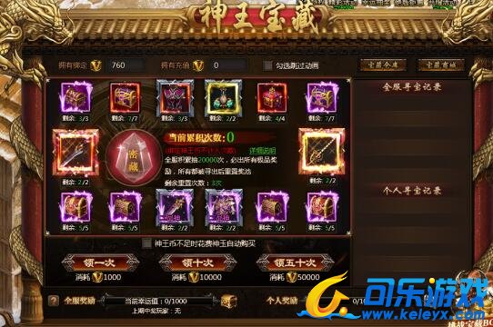 活动说明:神王宝藏限时发放极品装备、神器等,全服寻宝达到一定次数可获得保底奖励