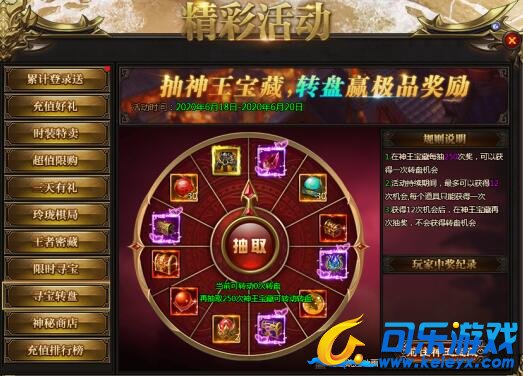 活动说明:每抽取250次神王宝藏可获得转盘机会,转动转盘获得极品保底奖励