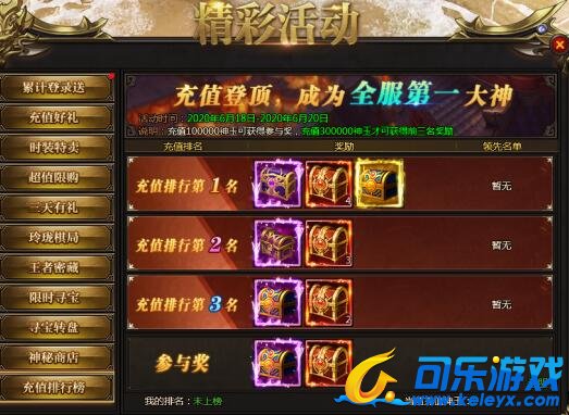 活动说明:名动本服,充值达到300000神玉即可参与排行,前三名均可获得极品自选宝箱。充值达到100000神玉即可获得参与奖。奖励会在活动结束后通过邮件发放