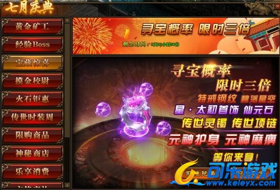 1.活动期间,玩家寻宝概率翻倍,极高几率获得星·太初首饰,传世灵器、传世灵甲,特戒钢纹,仙元石、碧落星空,传世灵器、传世灵甲,元神护身特戒以及元神麻痹特戒