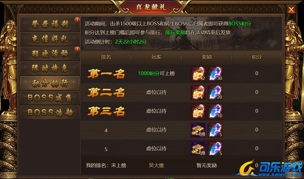 活动内容:活动期间击杀1500级以上的boss和转生boss获得积分,活动结束后更加排行邮件发送奖励