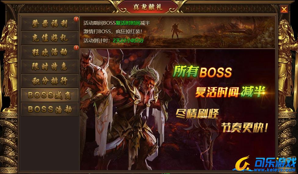活动内容:活动期间BOSS复活时间减半(跨服BOSS除外)