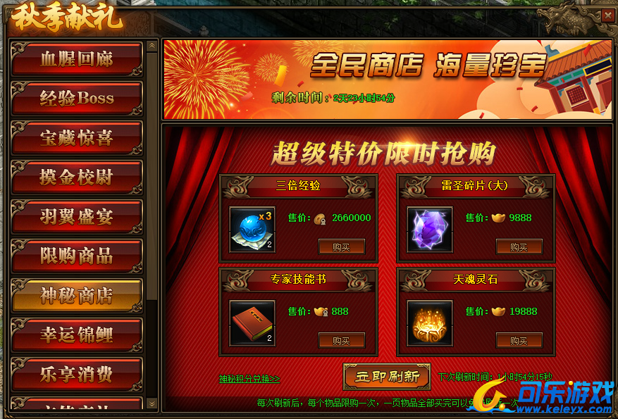 2.神秘商店每2小时自动刷新一次,也可用花费元宝立即刷新;