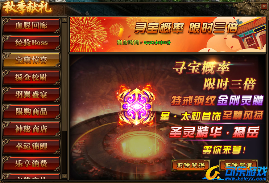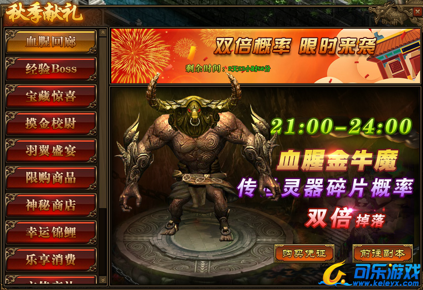 1.活动期间,玩家参与“多人副本-血腥回廊”,获得“传世灵器碎片”的概率翻倍;