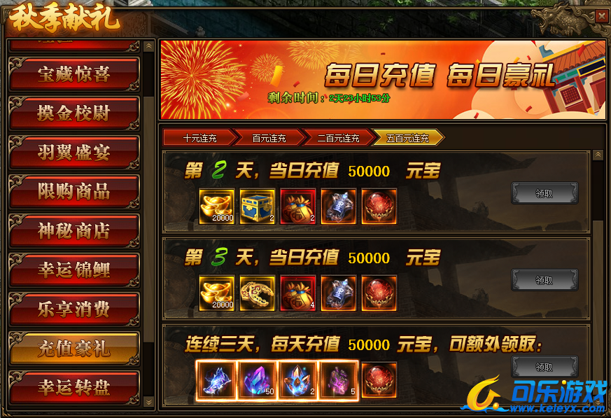2.连续充值达到3天,奖励翻倍领,更可领取暗影晶石、地狱晶石、随机7级阵法宝珠、雷霆装备等贵重物品