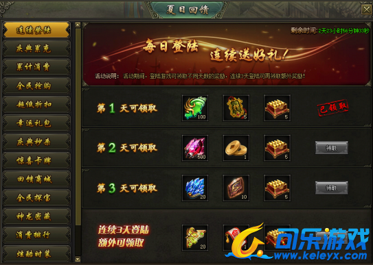 活动说明:活动期间,登陆游戏可领取不同天数的奖励,连续3天登陆可再领取额外奖励