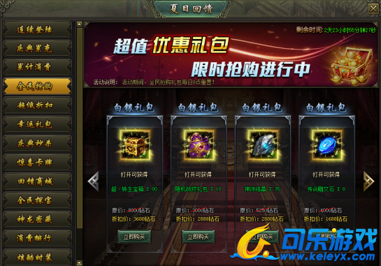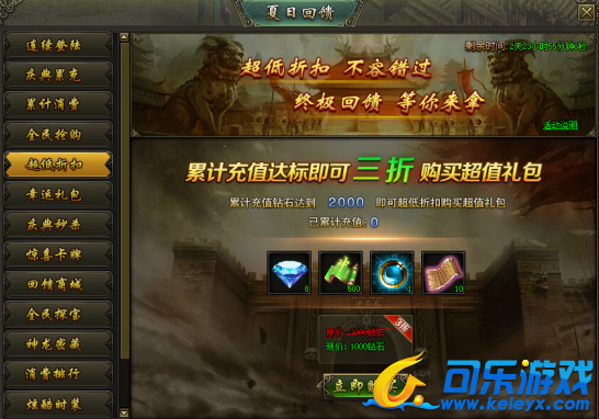 活动说明:活动期间,累计充值达到指定额度,即可购买超低折扣礼包