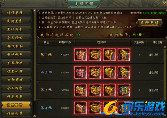 活动说明:活动期间,累计消费达到100000钻石的玩家参与排行,根据消费的钻石数可以获得各个档位的珍贵装备、稀有道具等奖励,奖励在活动结束后以邮件的方式进行发放