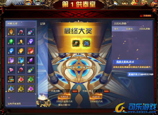 2. 玩家可使用金币和钻石进行供奉,每次供奉后可获得奖池内随机一件奖励,只有使用钻石供奉可额外获得太阳礼券
