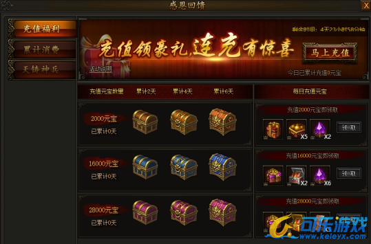 活动期间,充值满一定数量元宝,即可领取每日充值元宝对应档奖励,每档奖励每天均可领取一次,同时累计充值元宝满一定数量且达到要求天数,还可额外领取对应累计天数充值元宝对应档奖励,机会只有一次,不容错过。