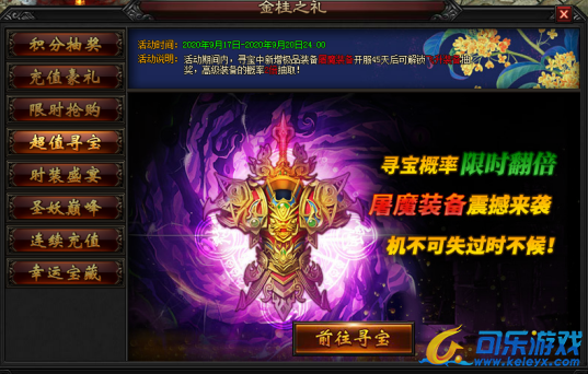 4.2 活动期间内,寻宝中新增屠魔装备,45天后解锁飞升装备。并且高级装备的概率双倍抽取