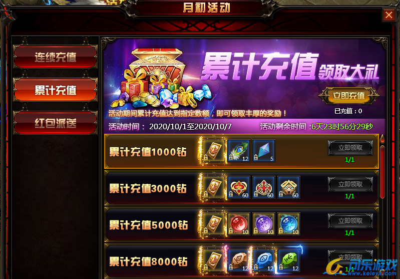 活动内容:玩家在活动时间内,累计充值达到一定钻石即可获得丰厚礼品,超值奖励等你来拿!
