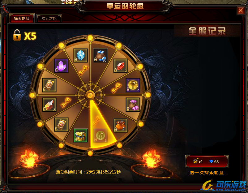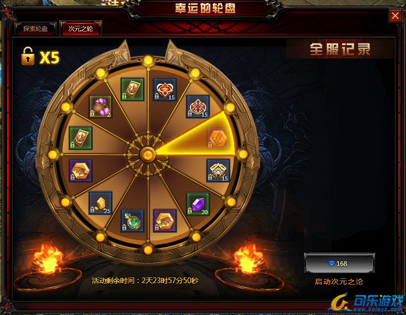 活动内容:玩家在活动时间内,使用68钻石可购买一次转盘机会,每获得5个次元要是可开启一分钟的次元之轮,次元之轮每次需要168钻石,奖励丰厚不容错过。