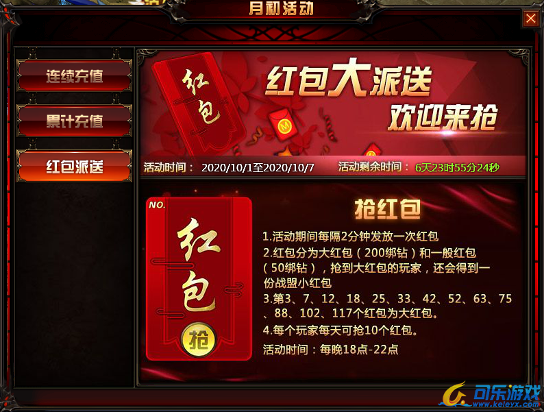 活动内容:玩家在活动期间,全服玩家同时抢红包,每人每天最多抢10次,还有大大红包等你来抢!