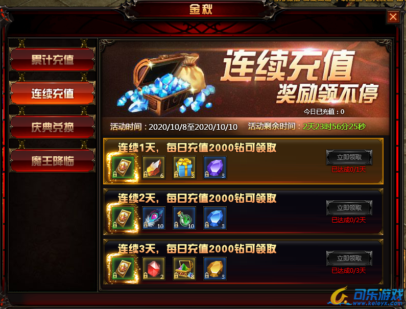 活动内容:活动时间内,玩家每日充值达到2000钻,即可获得丰厚奖励!