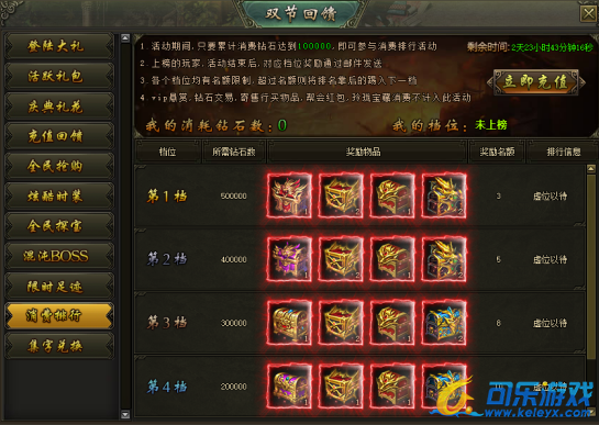 活动说明:活动期间,累计消费达到100000钻石的玩家参与排行,达到对应档位的玩家奖励在活动结束后以邮件的方式进行发放