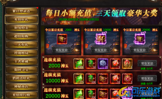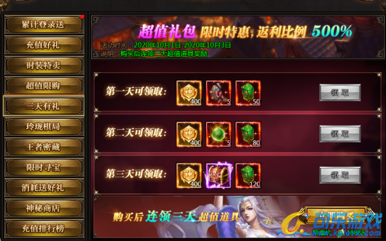 活动说:每日充值可以领取充值宝箱,连续三天充值更有额外极品奖励