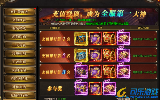 活动说明:名动本服,充值达到100000神玉即可参与排行,前三名均可获得极品自选宝箱。充值达到50000神玉即可获得参与奖。奖励会在活动结束后通过邮件发放
