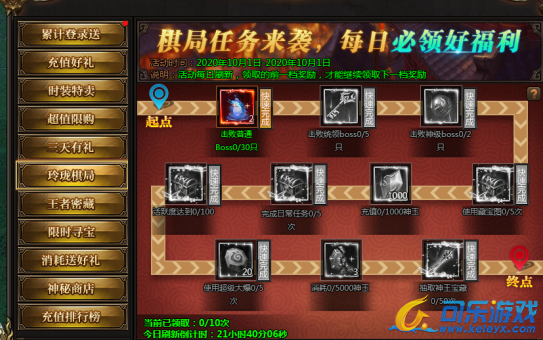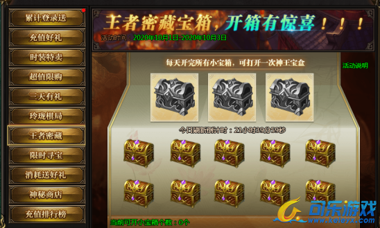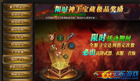 活动说明:神王宝藏限时发放极品装备、神器等,全服寻宝达到一定次数可获得保底奖励