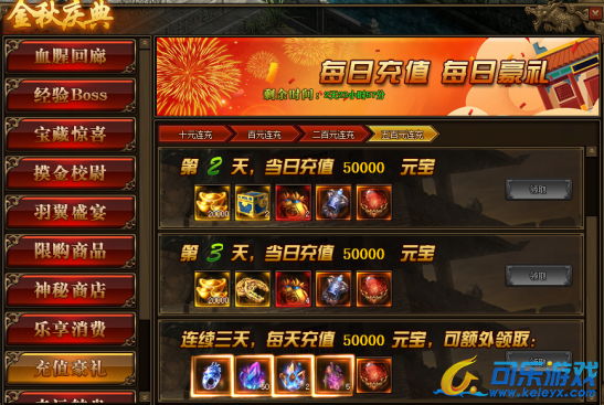 2.连续充值达到3天,奖励翻倍领,更可领取暗影晶石、地狱晶石、随机7级阵法宝珠、雷霆装备等贵重物品