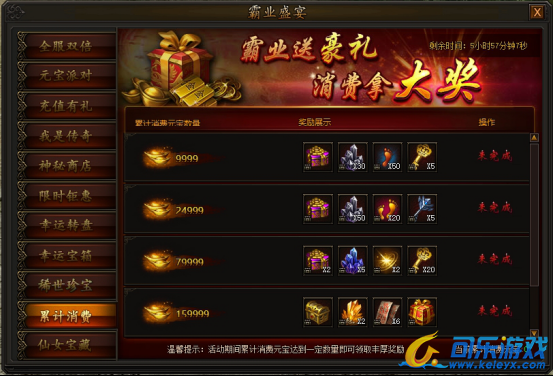 活动期间,累计消费一定数量元宝,即可领取对应档奖励,每个角色只能领取一次。