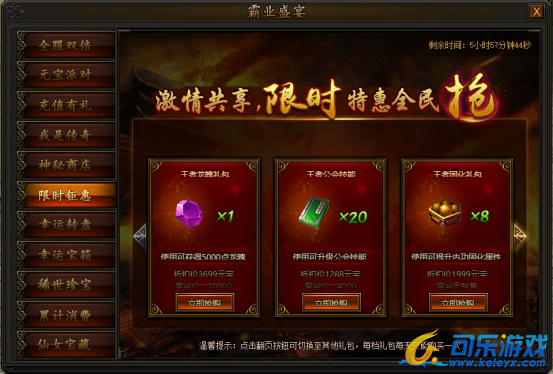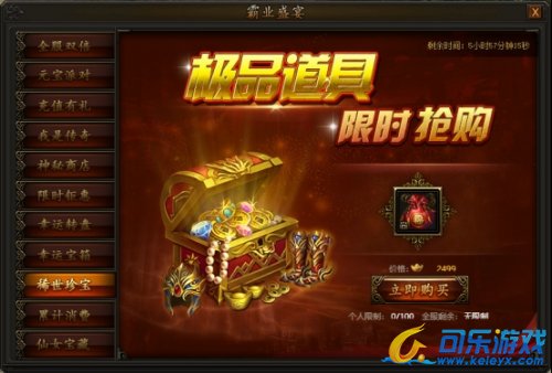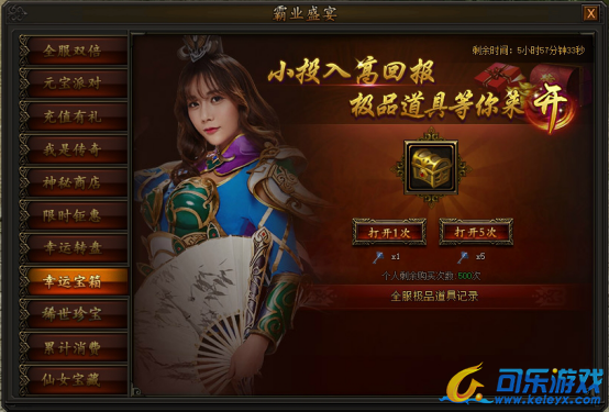 活动期间,80级以上(包含80级)玩家每天最多可购买300次,打开幸运宝箱可随机获得一种道具,多买多得,极品道具等你来开!钥匙可从稀世珍宝中获得。