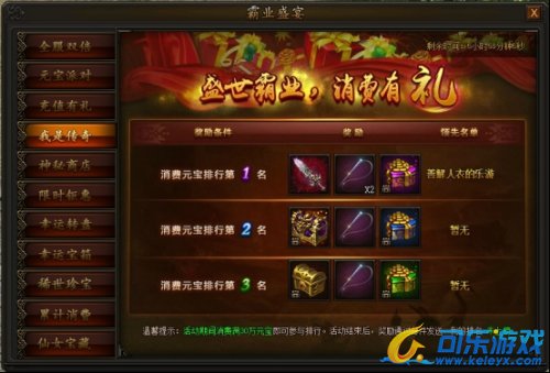 活动期间,累计消费满30w元宝即可参与排行,排行前3名即可获得霸业以及高级转生装备,豪礼不容错过。