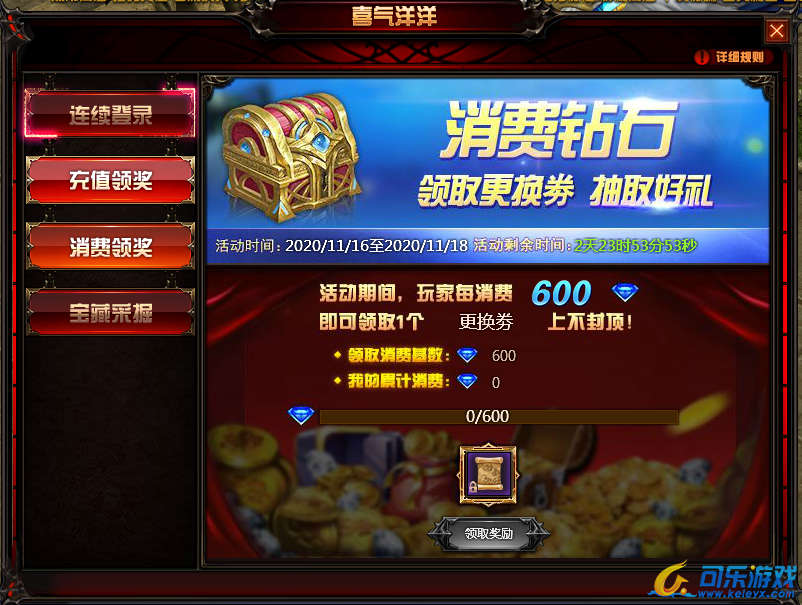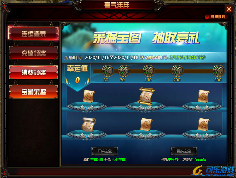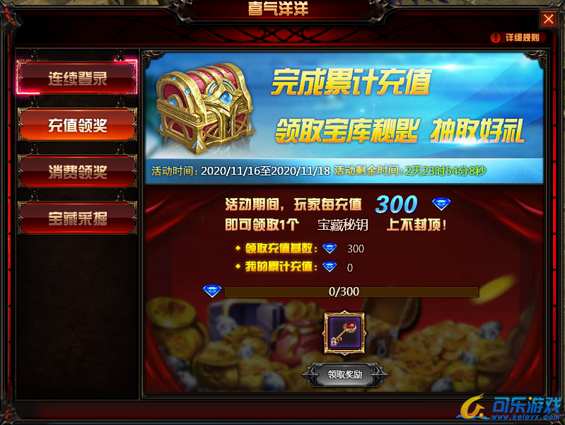 每充值300钻石可获得1个“宝藏秘钥”,每消费600钻石可获得1个“更换券”。