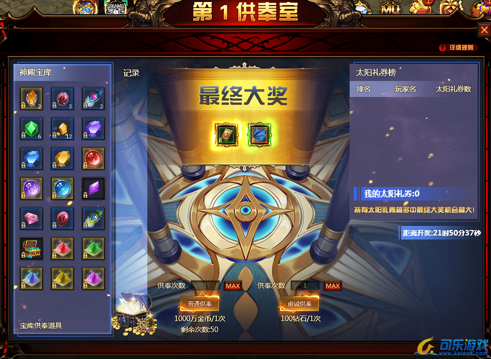 2.玩家可使用金币和钻石进行供奉,每次供奉后可获得奖池内随机一件奖励,只有使用钻石供奉可额外获得太阳礼券