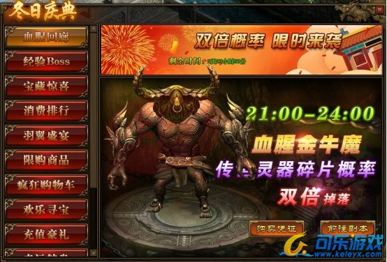 1.活动期间,玩家参与“多人副本-血腥回廊”,获得“传世灵器碎片”的概率翻倍;