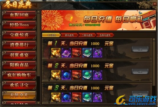 2.连续充值达到3天,奖励翻倍领,更可领取暗影晶石、地狱晶石、随机7级阵法宝珠、雷霆装备等贵重物品