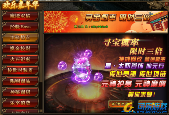1.活动期间,玩家寻宝概率翻倍,极高几率获得星·太初首饰,特戒钢纹、仙元石、碧落星空,传世灵器、传世灵甲,传世灵器·手镯碎片、传世灵器·项链碎片,元神麻痹特戒以及元神护身特戒