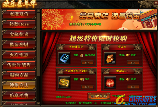 2.神秘商店每2小时自动刷新一次,也可用花费元宝立即刷新;