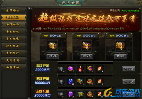活动说明:活动期间,每天累计充值到指定档位即可领取对应奖励,连续充值3天可领取连充大奖