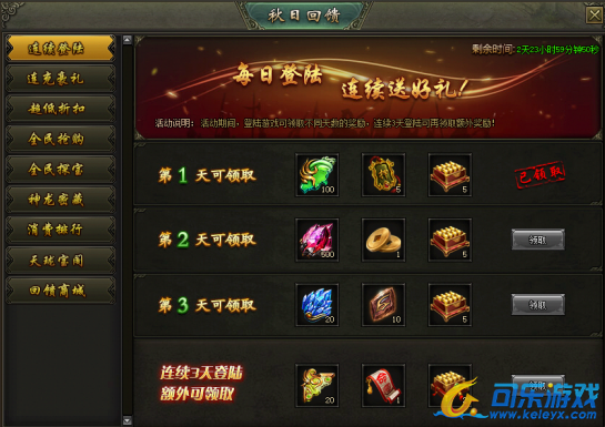 活动说明:活动期间,登陆游戏可领取不同天数的奖励,连续3天登陆可再领取额外奖励