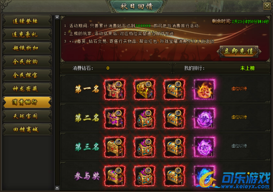 活动说明:活动期间,累计消费达到300000钻石的玩家参与排行,上榜的玩家奖励在活动结束后以邮件的方式进行发放