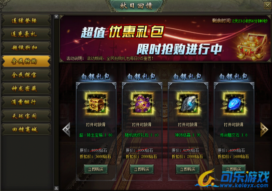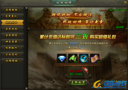活动说明:活动期间,累计充值达到指定额度,即可购买超低折扣礼包