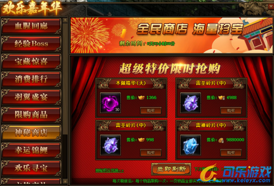 2.神秘商店每2小时自动刷新一次,也可用花费元宝立即刷新;