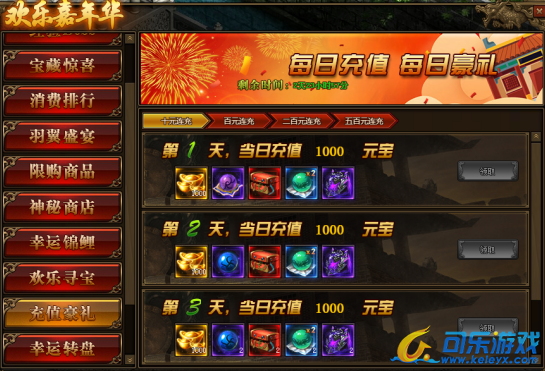 2.连续充值达到3天,奖励翻倍领,更可领取暗影晶石、地狱晶石、随机7级阵法宝珠、雷霆装备等贵重物品