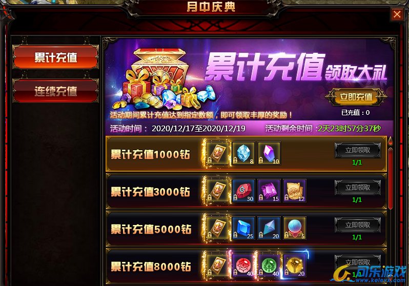 活动内容:活动时间内,玩家每日充值达到2000钻,即可获得丰厚奖励!