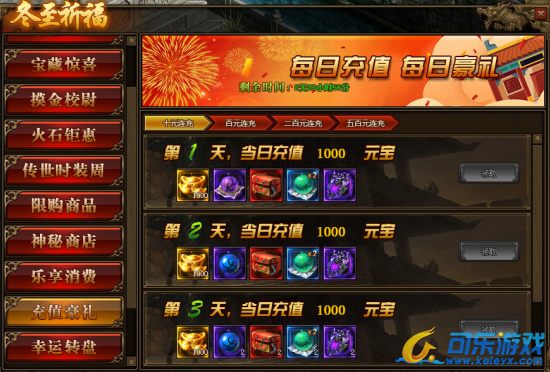 2.连续充值达到3天,奖励翻倍领,更可领取暗影晶石、地狱晶石、随机阵法宝珠宝箱等贵重物品
