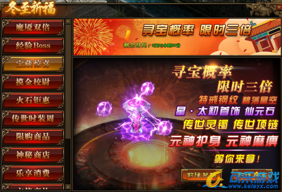 1.活动期间,玩家寻宝概率翻倍,极高几率获得星·太初首饰,特戒钢纹、仙元石、碧落星空,传世灵器、传世灵甲,传世灵器·手镯碎片、传世灵器·项链碎片,元神麻痹特戒以及元神护身特戒