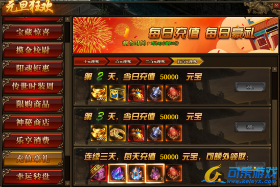2.连续充值达到3天,奖励翻倍领,更可领取暗影晶石、地狱晶石、雷霆装备等贵重物品